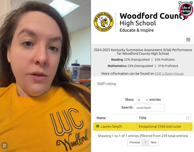 After we highlighted the video, Libs of TikTok conducted research and identified the teacher as Lauren Smyth, an "Exceptional Child Instructor" at Woodford County High School.