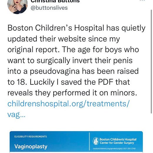 New evidence has come out clearly stating that Boston Children’s has done and would do “gender affirming” surgeries on Minors. Check out this thread from Wesley Yang.