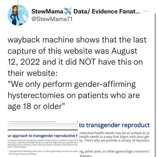 Although I never mentioned a specific age, Boston Children’s does in fact provide “gender-affirming” surgeries for minors. After the videos went viral, they quietly updated their website. They changed the age of requirement for a vaginoplasty from 17 to 18 and added “we only perform gender-affirming hysterectomies on patients who are age 18 or older.” It appears that Politifact and Boston Children’s worked together to cover up for the fact that minors were allowed to receive genital and breast mutilation surgeries as well as eliminating the possibility for a young girl to ever get pregnant through a hysterectomy.