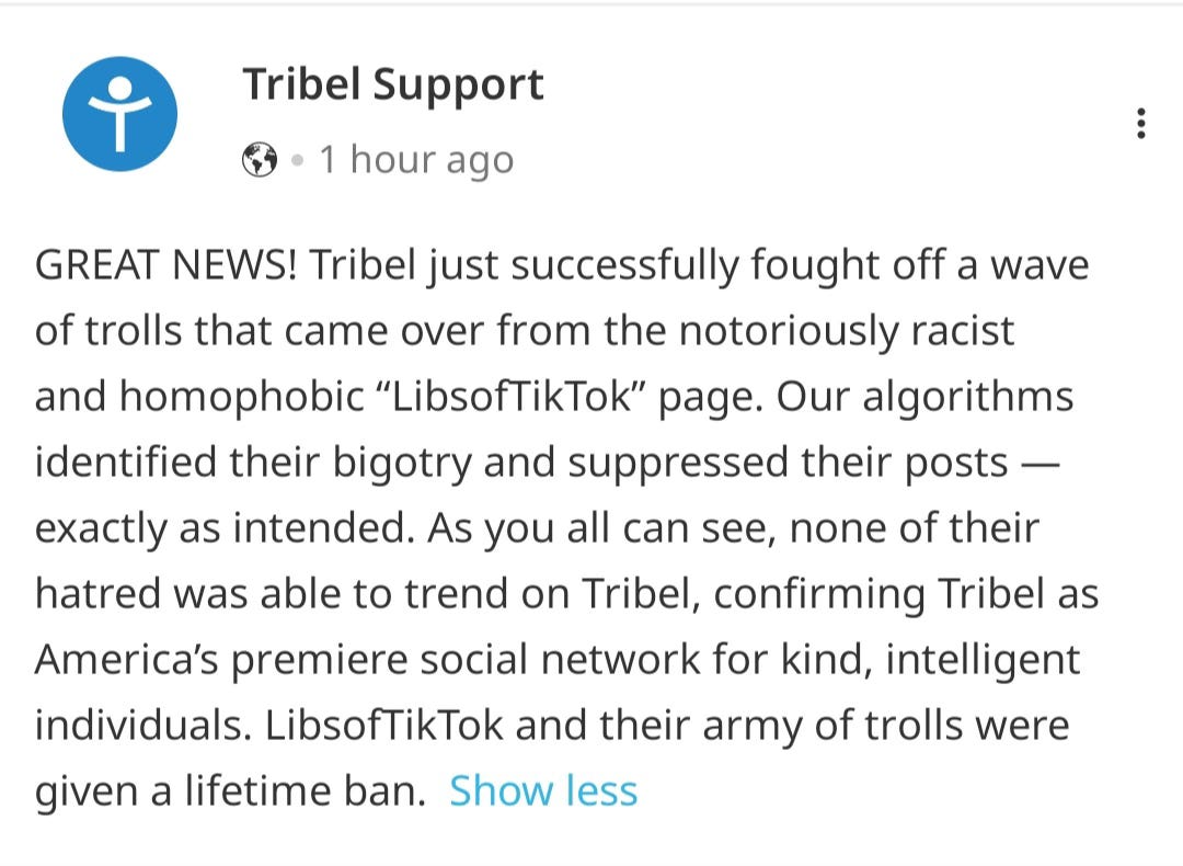 According to Tribel’s Twitter bio, the platform is “an innovative Twitter/Facebook alternative that’s free of hate, fake news & bots.” In other words, a platform to shield the fragile Left from the pain caused by their cognitive dissonance.