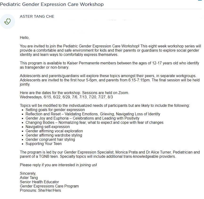 The mother, who spoke to Libs of TikTok on the condition of anonymity, said she was tipped off to Kaiser’s gender-affirming workshop after looking through her child’s patient portal. Her 16-year-old trans-identifying teen received an email with an invitation to join the “Pediatric Gender Expression Care Workshop,” a series of courses on social gender transitions. There is no parental permission required to join the workshop, according to the email provided.