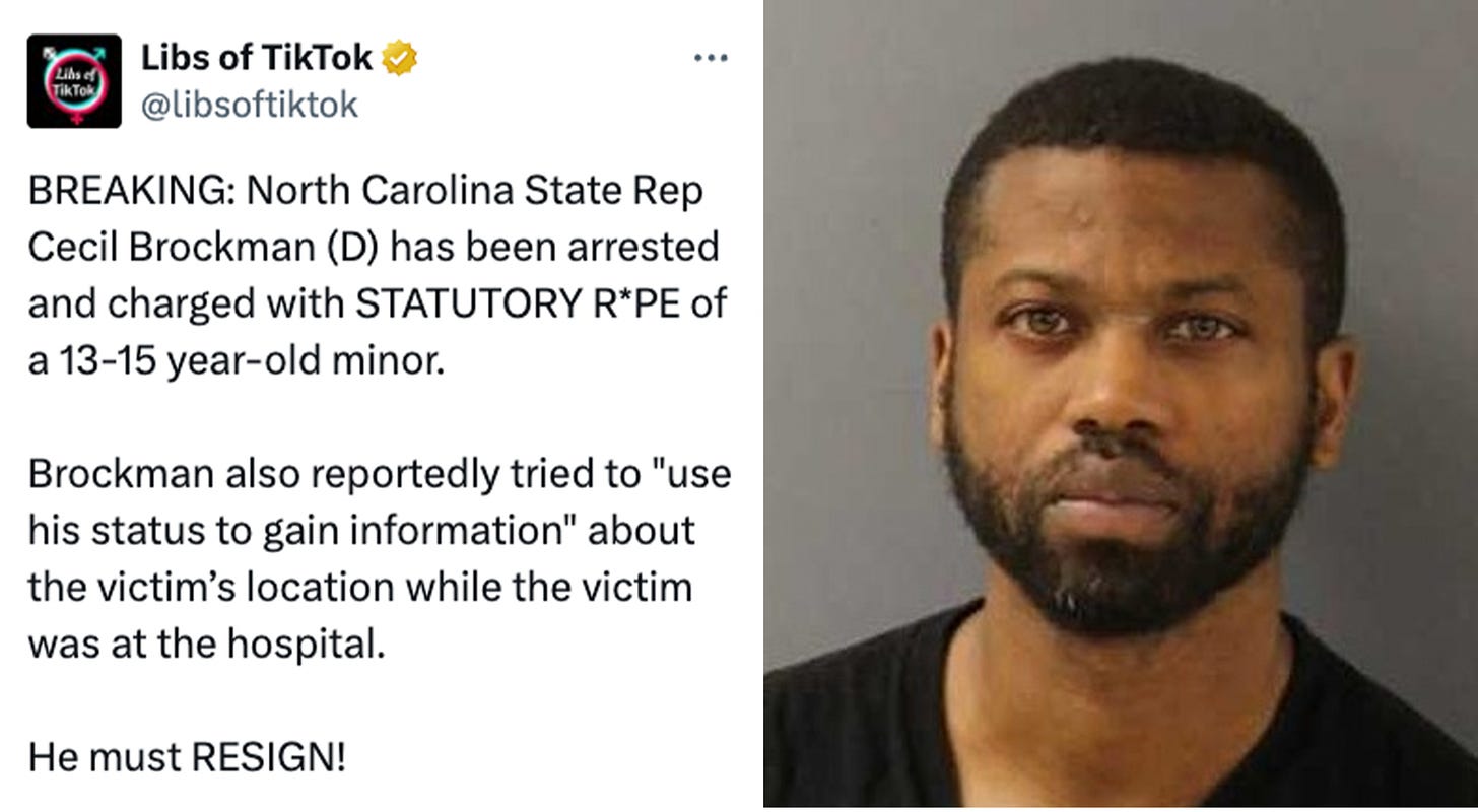 It was also discovered that Democrat North Carolina State Rep Cecil Brockman, who was arrested and charged with the STATUTORY RAPE of a minor earlier this month, had voted AGAINST NC’s Parental Rights Bill back in 2023.