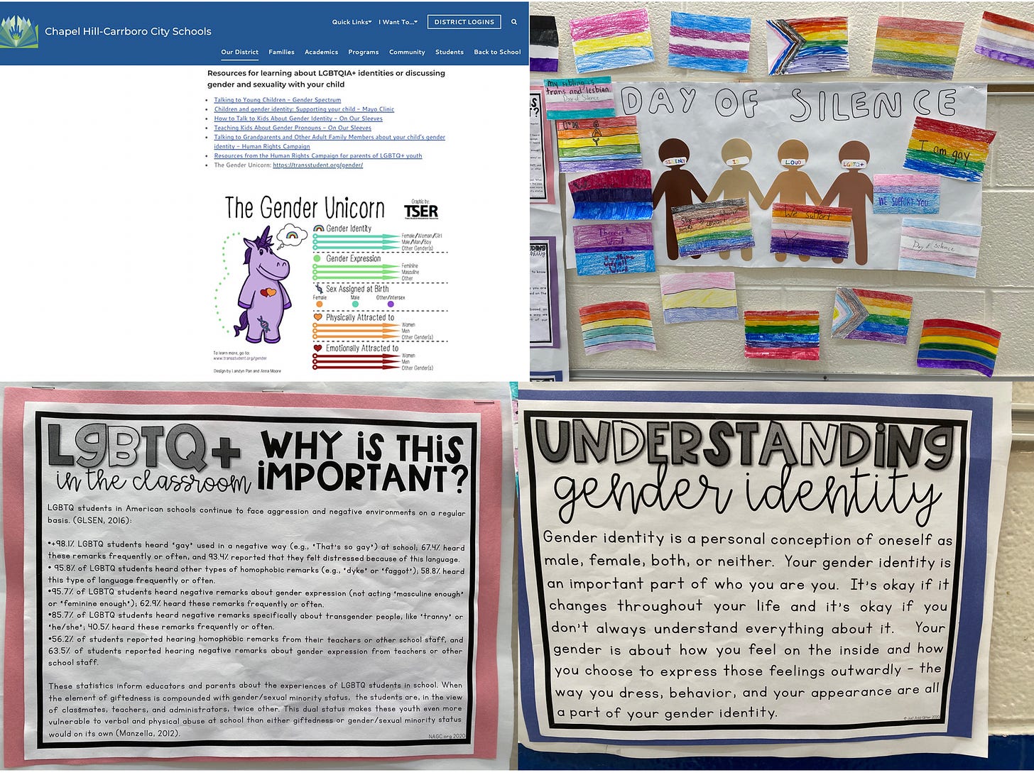 It was then discovered that CHCCS is pushing radical gender ideology propaganda at schools, which includes “Trans Day of Silence” collages, “Understanding Gender Identity” posters, and “The Gender Unicorn” resource guides.