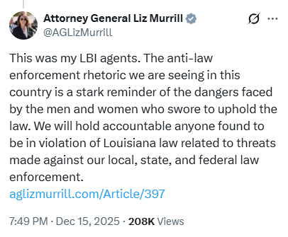 Liz Murrill, the Attorney General for Louisiana, responded to our story, identifying the officers as her LBI agents and vowing to “hold accountable anyone found to be in violation of Louisiana law related to threats made against our local, state, and federal law enforcement.”