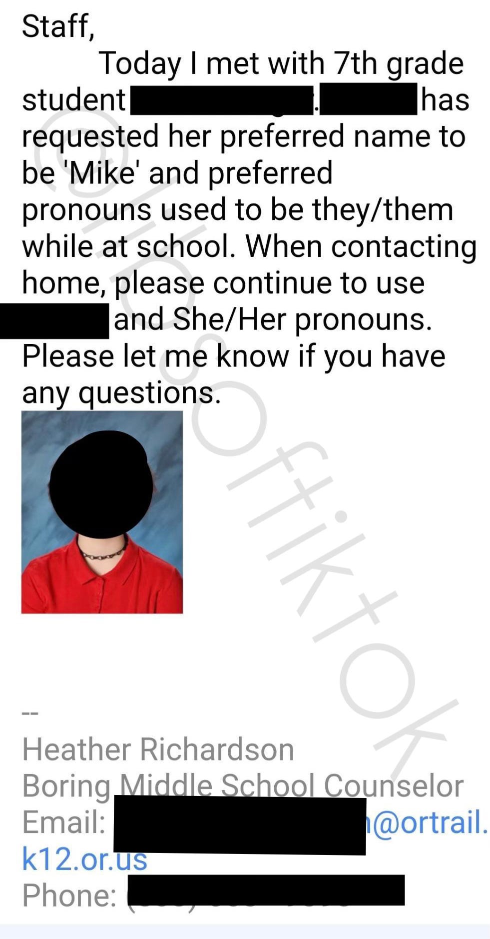 Heather Richardson, the school’s counselor, sent an email to staff directing them to refer to a female 7th-grade student as “Mike” and use “they/them” pronouns in school. However, Heather cautioned staff to refer to the student using her given name and “she/her” pronouns when talking to the student’s parents so the parents would not be tipped off about their child transitioning into an identity other than female.