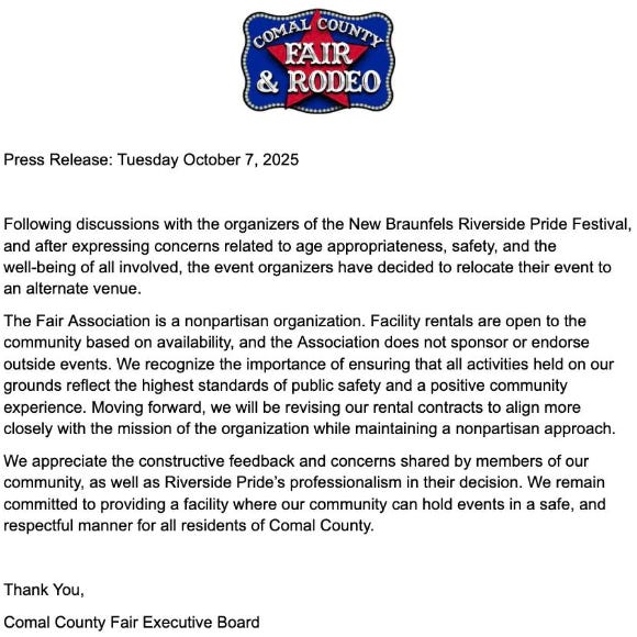 The Comal County Fair & Rodeo also committed to revising its contracts to align more closely with its “nonpartisan” mission.