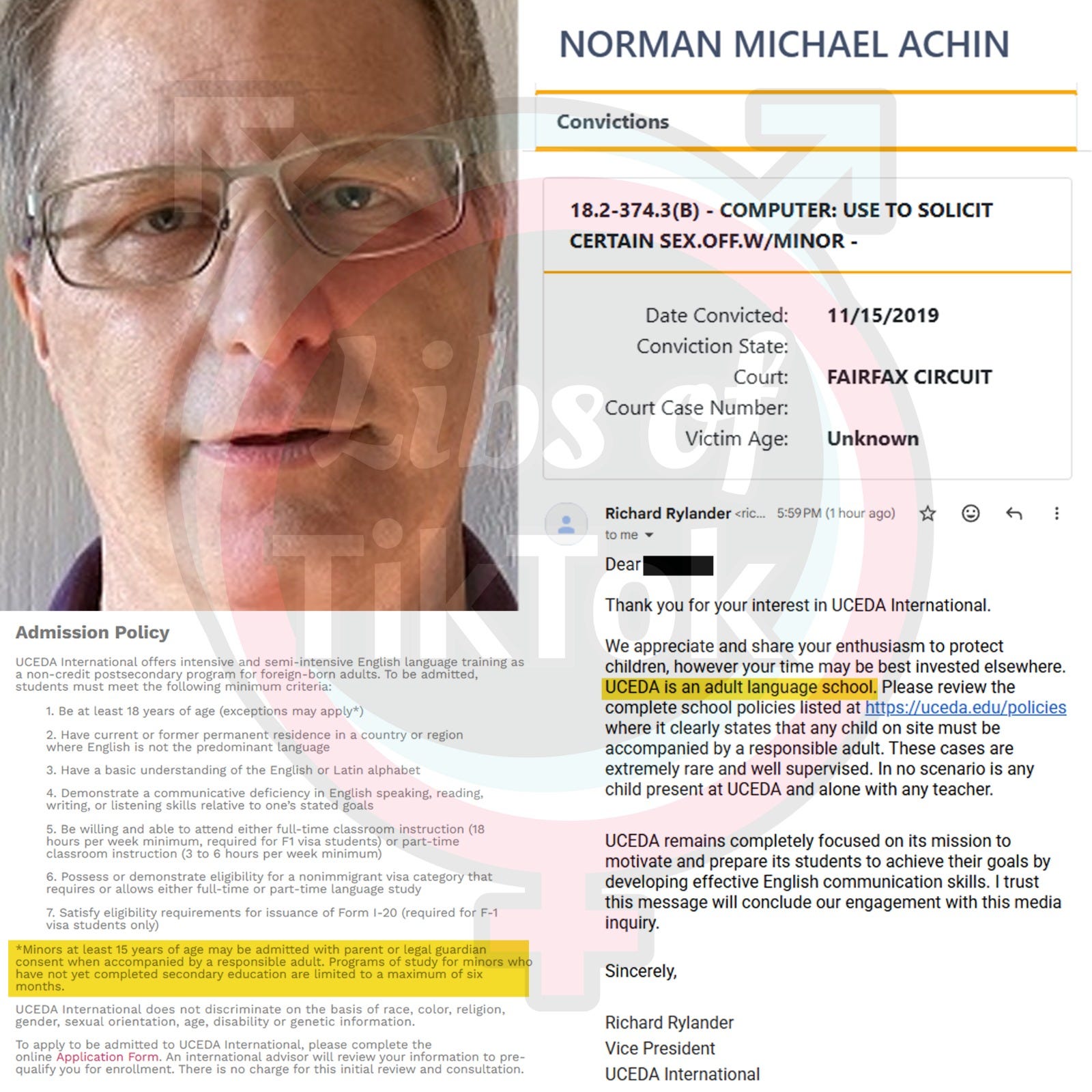 Norman Achin, a REGISTERED CHILD SEX OFFENDER employed by UCEDA International, an English study program in Virginia, was FIRED from his position after we exposed the company for potentially putting children in harm’s way.