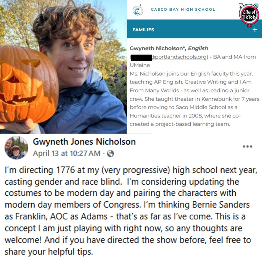 Gwyneth Jones Nicholson, an English teacher at Casco Bay High School in Maine, planned to direct a "very progressive" version of the play '1776' which replaces the founding fathers with current far-left politicians like AOC and Bernie Sanders.