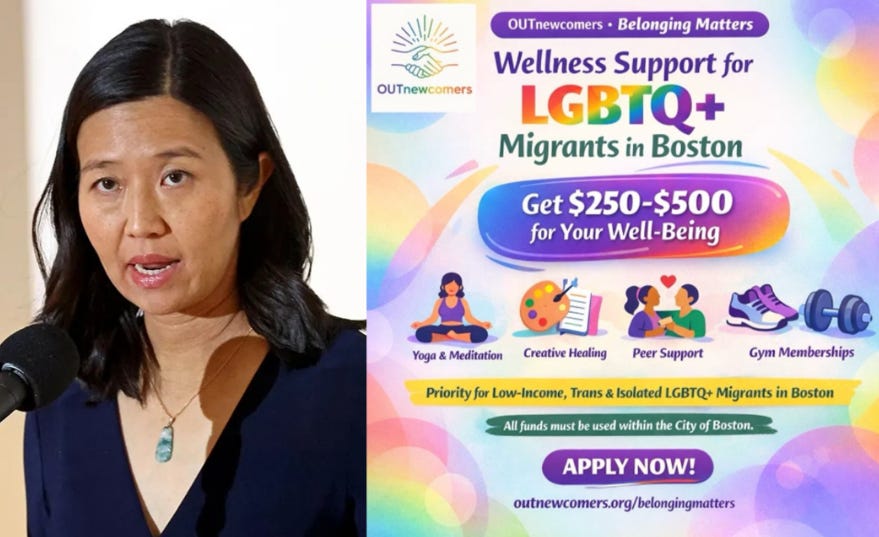 Michelle Wu, the Democratic Mayor of Boston, planned to launch a new program to distribute $250-$500 vouchers to "LGBTQ+ Migrants" for free “wellness support,” which includes yoga classes, salon visits, massages, gym memberships, and MORE.